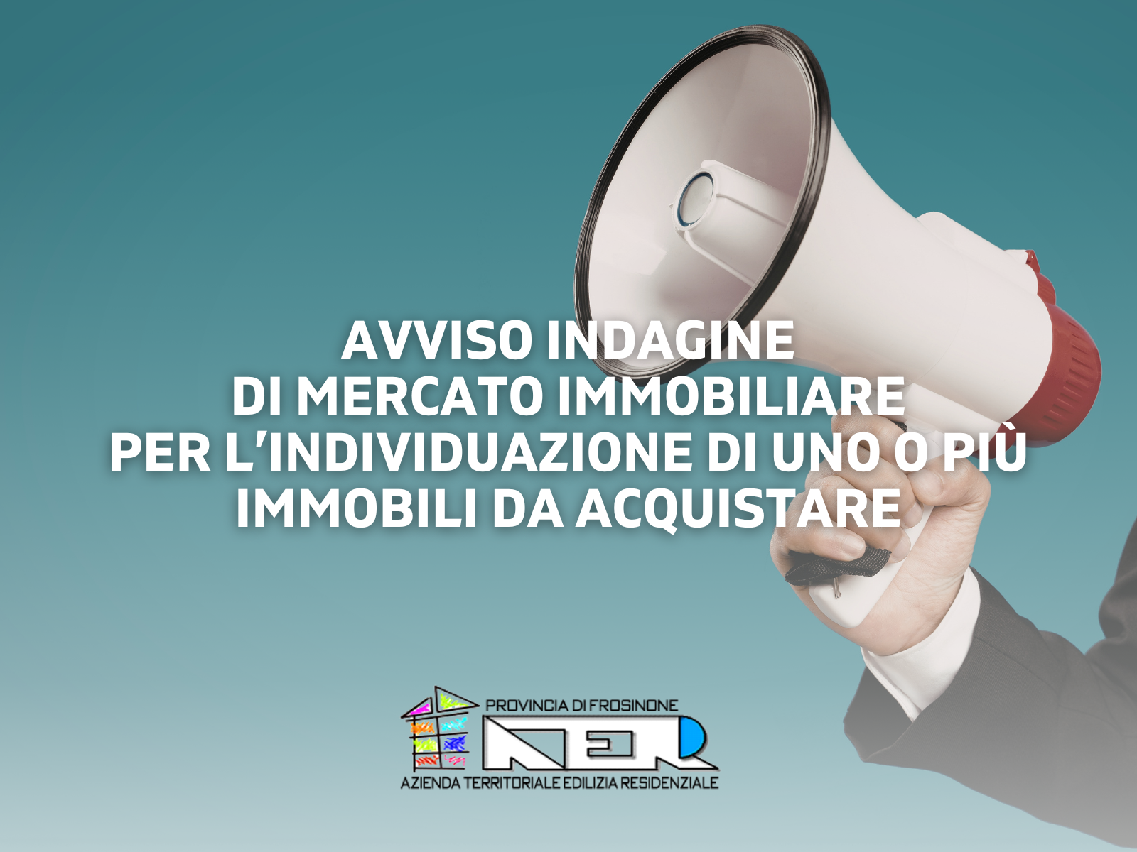 Di seguito la documentazione per la partecipazione all'Avviso Pubblico di indagine di mercato immobiliare per l'individuazione di uno o più immobili da acquistare al fine di adibire i medesimi ad uffici per lo svolgimento delle attività dell'ATER della Provincia di Frosinone ed il relativo provvedimento direttoriale.